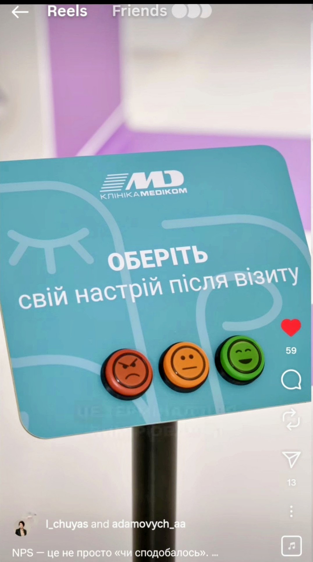 Разом із LiketoMe Medikom поєднала два канали зворотного зв'язку: SMART-термінал біля виходу з кабінету для швидкої оцінки одним натисканням кнопки та SMS-опитування для більш розгорнутого зворотного зв'язку.